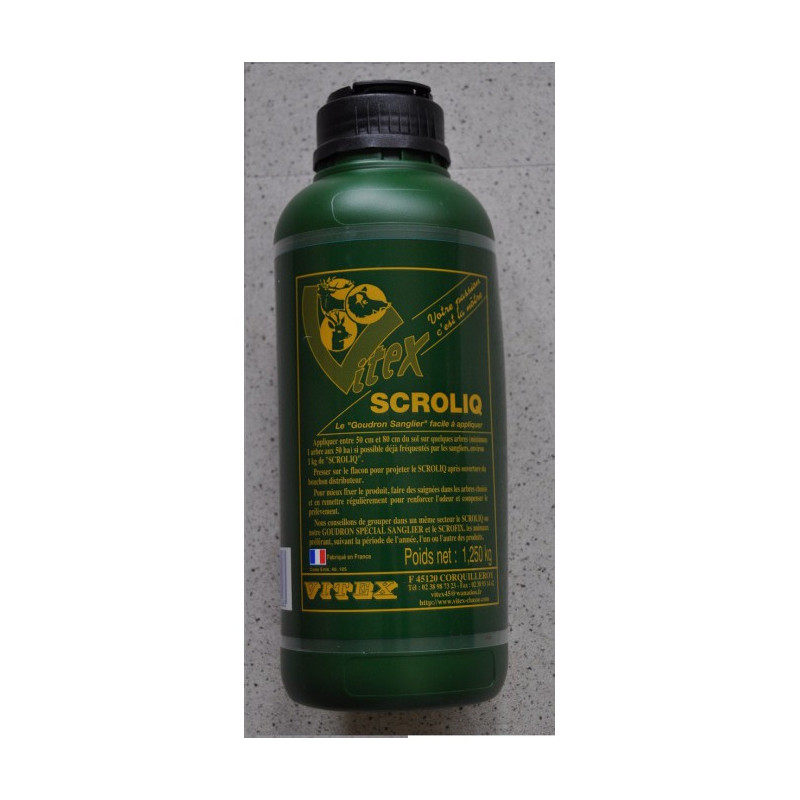 Goudron liquide de norvège. Très concentré les sangliers adorent se frotter contre les arbres traités au goudron. Avec son bec verseur sont utilisation est des plus simple.