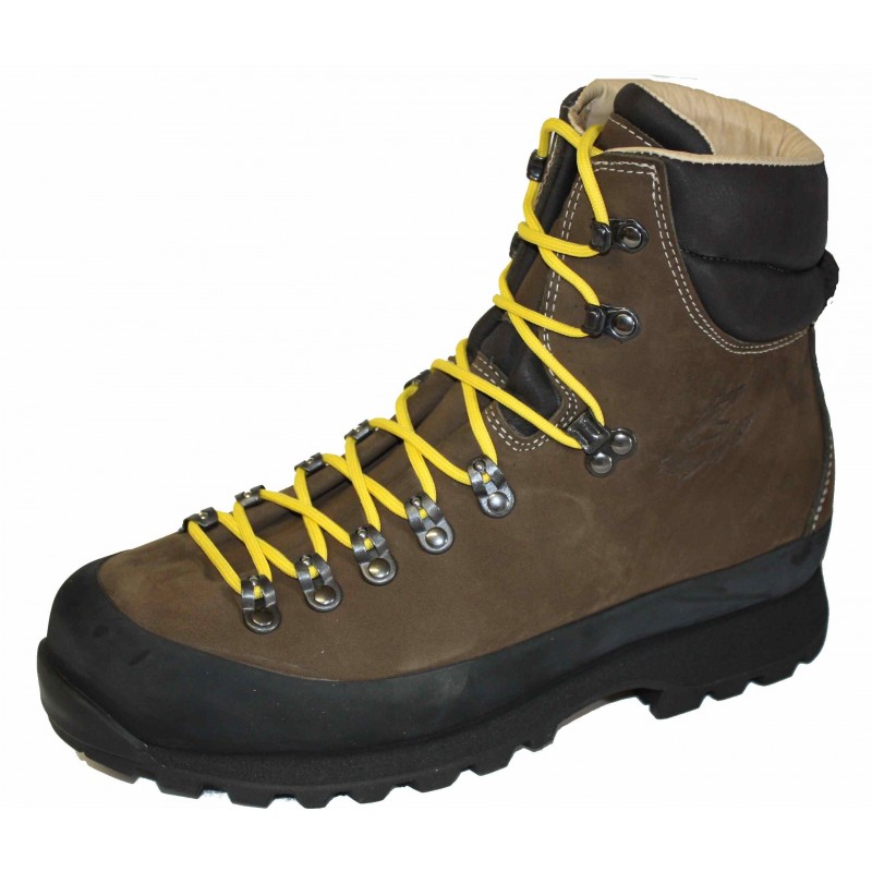 Chaussure cuir + doublure cuir. Semelle Vibram, pare pierres et amortisseur de marche. Limite la transpiration. Bonne résistance au froid.Serrage par roulement à billes. Poids 850gr