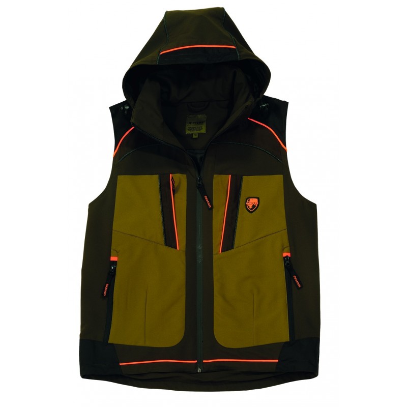Gilet en Softshell. Avec capuche. 6 poches + carnier. Très belle finition . Poches zippées. Marque UNIVERS