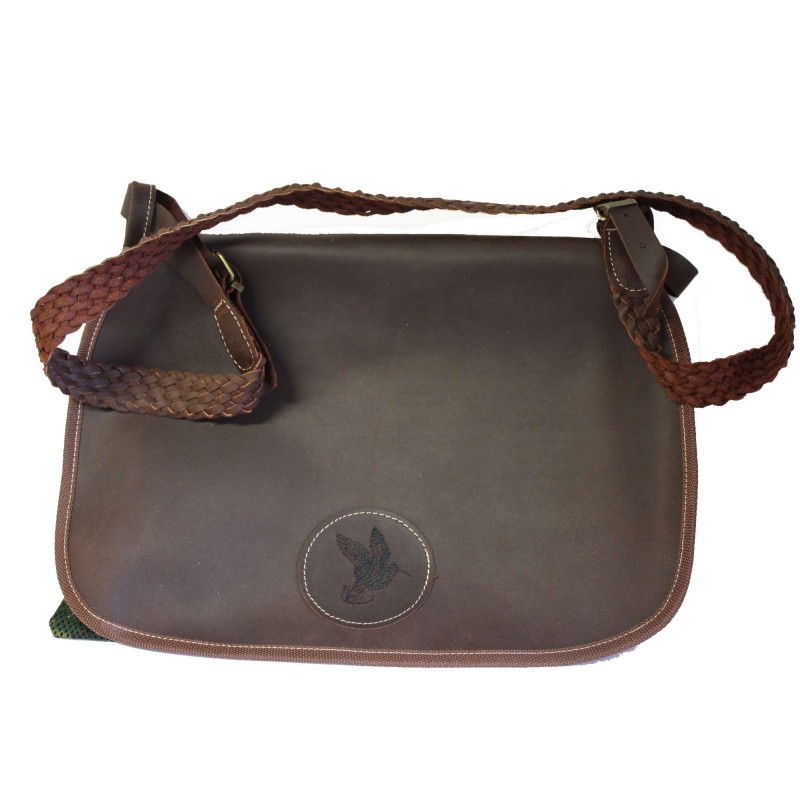 Musette cuir gras. Broderie Bécasse. Filet pour gibiers. Sange réglable en cuir tréssée. Très belle finition.