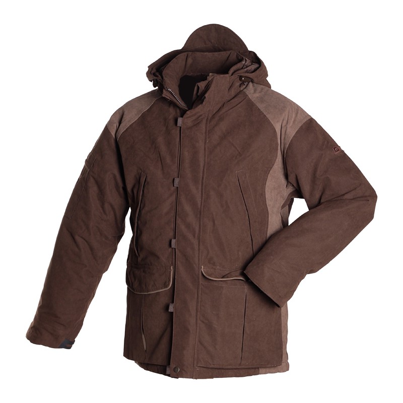 Veste à membrane imperméable, doublée polaire. Silencieuse. Nombreux renforts. Carnier + capuche amovible. Spéciale grand froid.